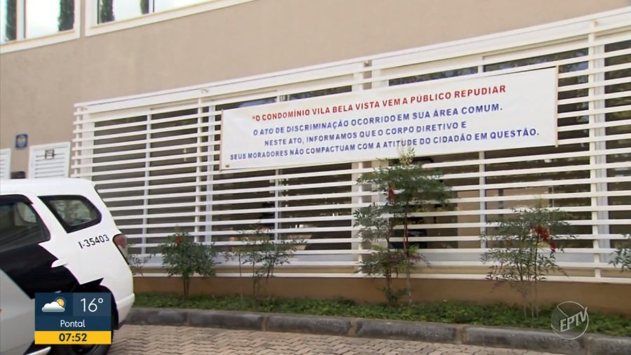 “O Condomínio Vila Bela Vista vem a público repudiar o ato de discriminação ocorrido em sua área comum. Neste ato, informamos que o corpo diretivo e seus moradores não compactuam com a atitude do cidadão em questão”, diz a faixa pendurada na entrada. A imagem foi registrada pela EPTV, afiliada da TV Globo no interior paulista.
