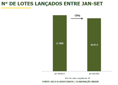 De acordo com Pesquisa do Mercado de Loteamentos, realizada por Aelo, Brain Inteligência Estratégica e Secovi-SP, nos nove meses deste ano foram lançados 20.812 lotes nos 65 municípios abrangidos. Comparado ao mesmo período do ano passado, a redução foi de 5%.