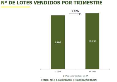 A pesquisa mostra que, no terceiro trimestre, foram comercializados 10,1 mil lotes, líquidos de distratos, volume 4% superior ao registrado no mesmo período de 2019 (9,8 mil lotes). No acumulado do ano, de janeiro a setembro de 2020, as vendas totalizaram 27,5 mil lotes, mantendo estabilidade na comparação a iguais nove meses de 2019, quando foram comercializados 27,5 mil lotes.