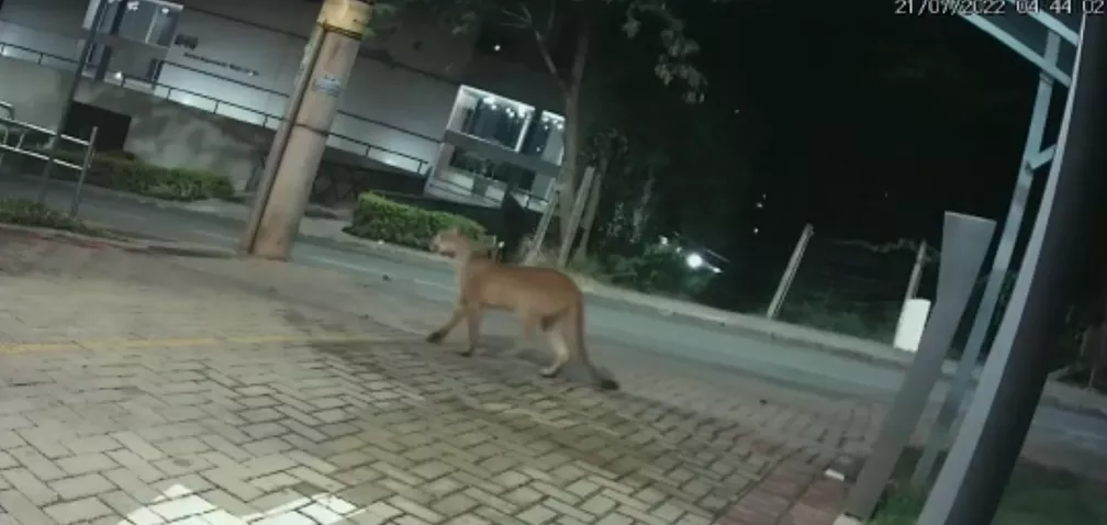 Câmeras de segurança de um condomínio no bairro Vila da Serra, em Nova Lima, na Grande BH, filmaram uma onça-parda andando nas redondezas do residencial na madrugada desta quinta-feira (21).