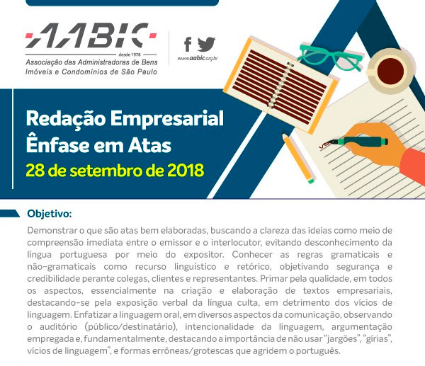 Informações e Inscrições: (11) 3059-3372 ou e.mail: treinamentos@aabic.org.br.