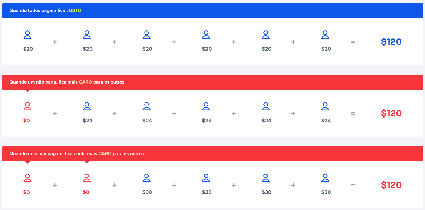 Já se dois moradores deixarem de pagar, serão R$ 40 para serem divididos por 4 moradores pagantes, fazendo a conta chegar a R$ 30.